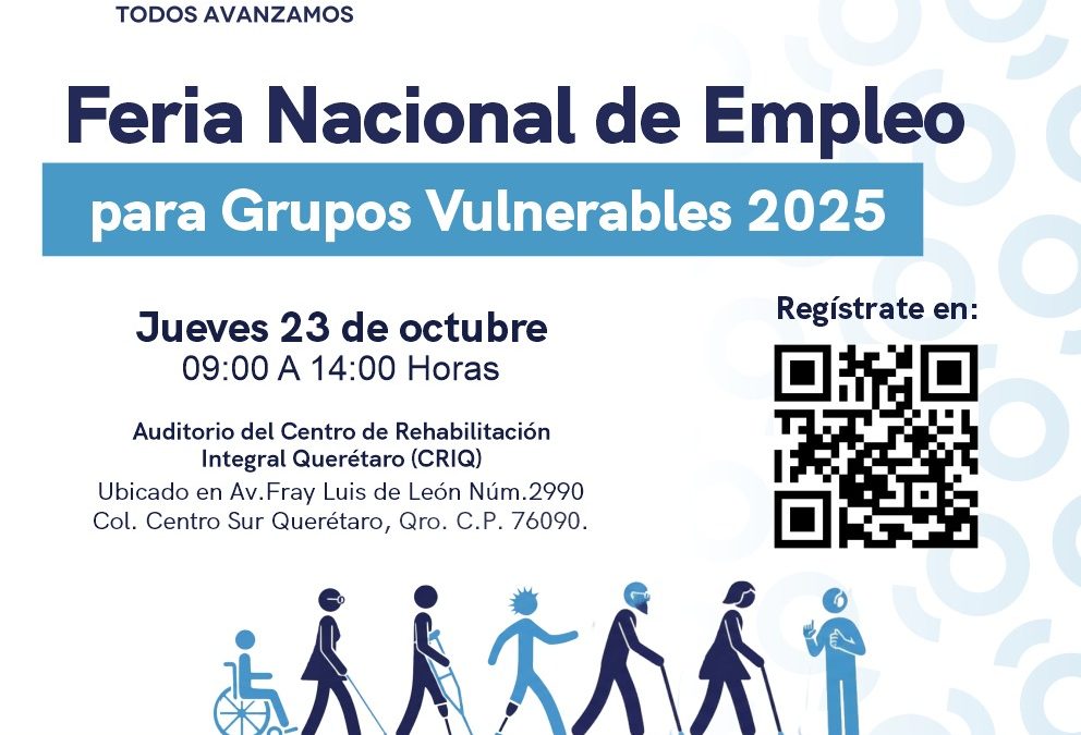 La Secretaría del Trabajo del Estado de Querétaro (ST) en coordinación con el Sistema Estatal DIF (SEDIF) invita a participar en la Feria Nacional de Empleo para Grupos Vulnerables 2025, que se llevará a cabo el jueves 23 de octubre, de 9:00 a 14:00 horas, en el Centro de Rehabilitación Integral de Querétaro (CRIQ).