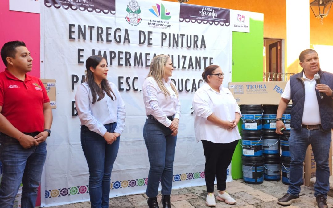 En total, 13 planteles educativos de los tres niveles de educación básica recibieron 84 cubetas de pintura, 9 cubetas de impermeabilizante y 20 luminarias, con las que realizarán labores de mantenimiento en sus edificios.