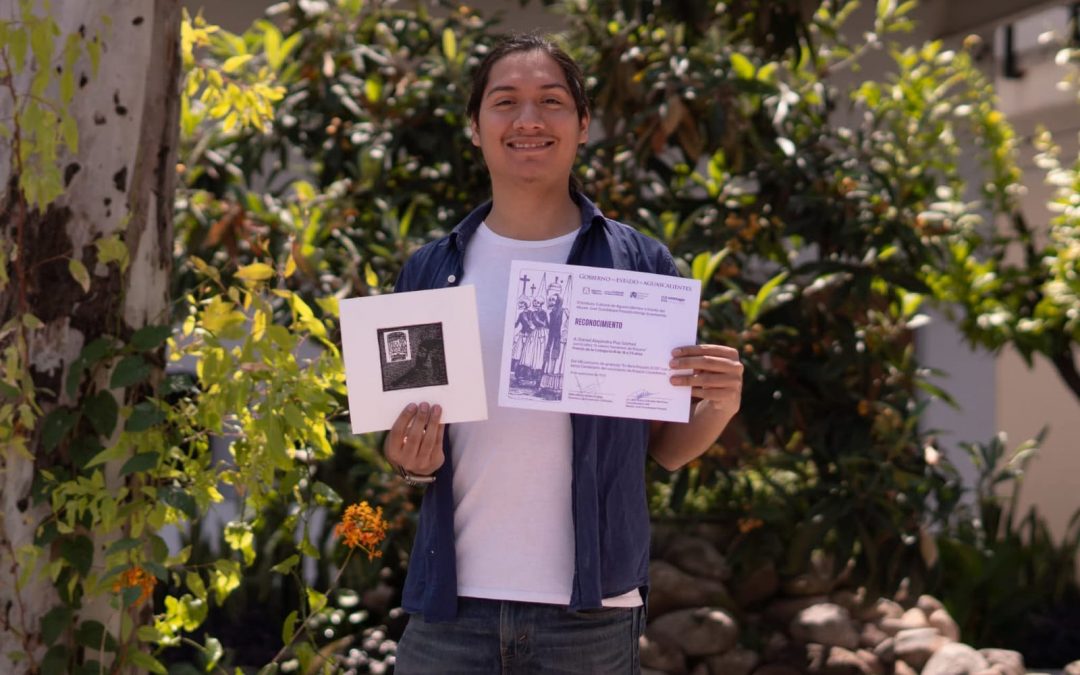 Paz Gómez, alumno de noveno semestre de la Licenciatura en Artes Visuales, destacó que este reconocimiento a nivel nacional lo impulsa a seguir adelante con su arte, trabajando en el método y en sus impresiones, además de motivarlo a buscar más participaciones en estas actividades y en bienales. En su litografía utilizó la técnica de grabado en punta seca en una placa de acrílico, en la que combinó las modalidades contemporáneas, entre ellas, el uso del láser.