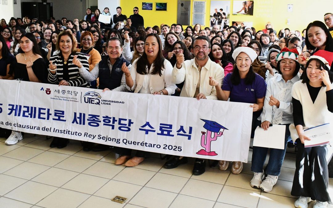 El rector de la Universidad Tecnológica de Querétaro (UTEQ), Luis Fernando Pantoja Amaro, encabezó la ceremonia de clausura del curso de idioma y cultura coreana del Instituto Rey Sejong (IRS) Querétaro, en el periodo septiembre-diciembre 2025, entregando certificados a más de 150 alumnos que concluyeron sus estudios en el aprendizaje del idioma en los niveles: 1a y b, 2a y b, así como 3a y b.