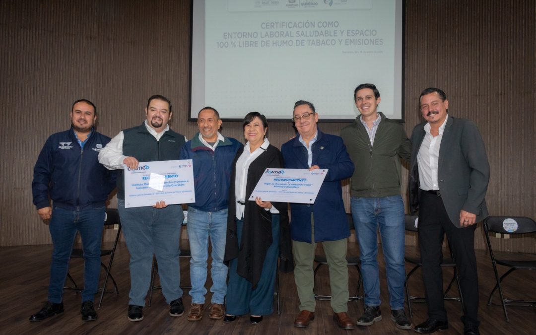La titular de la Secretaría de Salud (SESA) del estado de Querétaro, Martina Pérez Rendón, encabezó la ceremonia de entrega de placas que acreditan la certificación de diez edificios del municipio de Querétaro como Entornos Laborales Saludables y 100 por ciento Libres de Humo de Tabaco, reconocimientos que refrendan el compromiso institucional con la protección, promoción y fortalecimiento de la salud de las y los trabajadores.