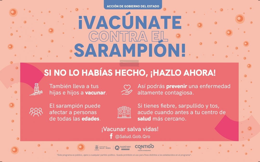 El sarampión es una enfermedad prevenible mediante la vacunación; por ello, la Secretaría de Salud exhorta de manera puntual a madres, padres y tutores a revisar la Cartilla Nacional de Salud de niñas y niños, así como a la población general menor de 49 años, a acudir de forma oportuna a los servicios de salud para iniciar o completar los esquemas de vacunación correspondientes. Las vacunas se encuentran disponibles de manera gratuita en los 198 Centros de Salud del estado de Querétaro.