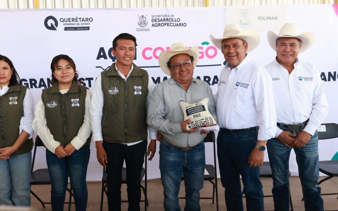 El secretario de Desarrollo Agropecuario, Rosendo Anaya, encabezó la entrega de apoyos consistentes en 142 toneladas de maíz para consumo humano, para los municipios de Tolimán y Peñamiller, a un total de 840 productores y sus familias, que sufrieron afectación en más de mil hectáreas de siembra de temporal y que vieron mermada su cosecha por la sequía prolongada o lluvias torrenciales
