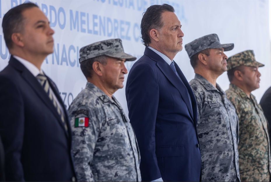 El titular del Poder Ejecutivo estatal, Mauricio Kuri González, estuvo presente en la toma de posesión al cargo y protesta de bandera del general Ricardo Melendrez Cervantes, quien asumió el puesto como coordinador estatal de la Guardia Nacional en Querétaro.